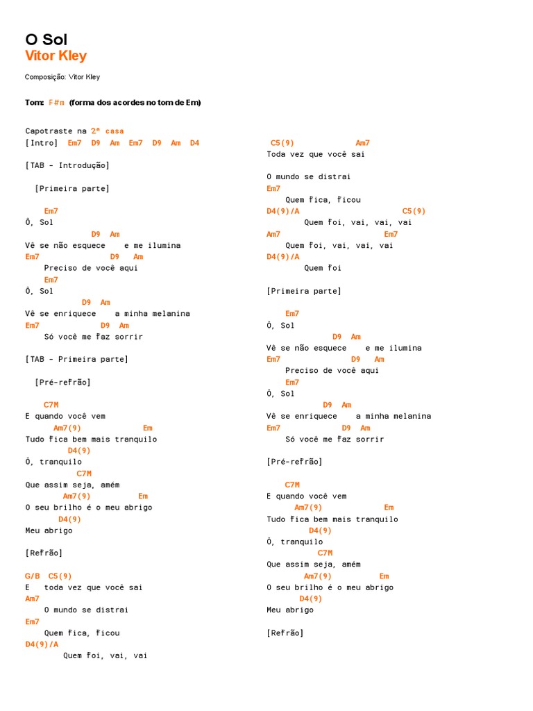 O Sol Vitor Kley Sheet Music For Violin Solo Musescore Com from musescore.com Em7 ô, sol d9 am vê se não esquece e me ilumina em7 d9 am preciso de você aqui em7 d9 am ô, solvê se enriquece a minha melanina em7 d9 am só você me faz sorrir. Share em o sol d am d vê se não esquece e me ilumina em d am preciso de você aqui d em o sol d am d vê se enriquece a minha melanina em d am d só você me faz sorrir. Ô, sol vê se não esquece e me ilumina preciso de você aqui ô, sol vê se enriquece a minha melanina só você me faz sorrir. Vitor kley o sol (vinne, double z remix). Vitor kley — armas a nosso favor 02:56. Please download one of our supported browsers. Vitor kley o sol (vinne, double z remix) #deephouse. Preciso de você aqui d em o sol d am d vê se enriquece a minha melanina em d am d só você me faz sorrir.